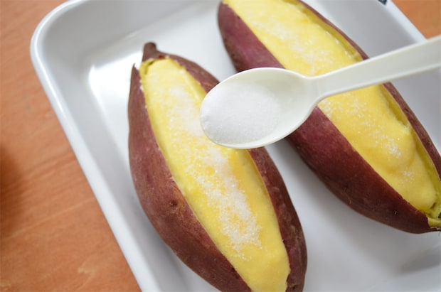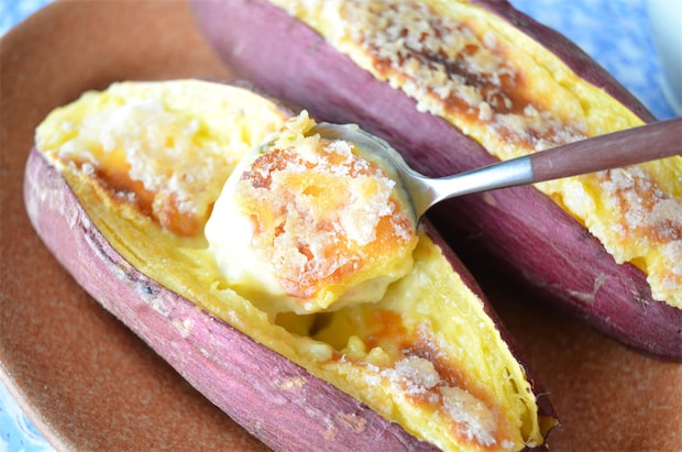 4. カスタードクリームをさつまいもの切れ込みに入れる。その上にグラニュー糖をかけて、1200Wのオーブントースターで10分程度、焦げ目がつくまで焼く。