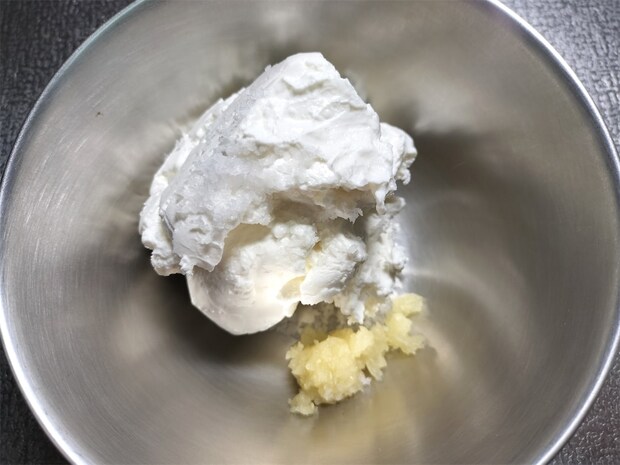 5. 別のボウルにヨーグルト、塩、にんにくを入れて混ぜます。