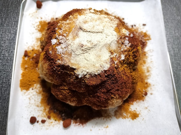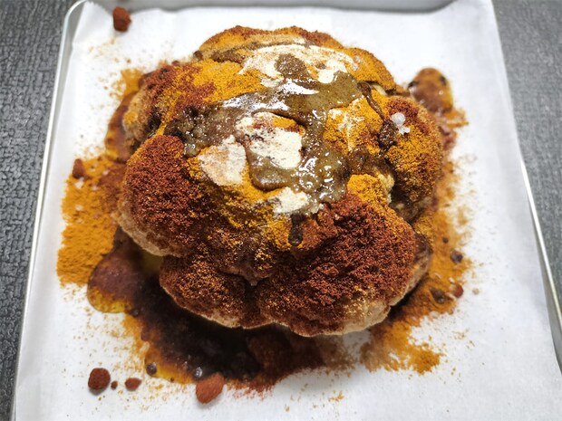 スパイスを振りかけた時点で、すでにけっこうな茶色でしたが、オーブンから出てきたカリフラワーはさらに濃い茶色になっていました。わたしはカリフラワーを生食するのが好きですので、多少生でも大丈夫だと思っていましたが、ちゃんと中まで熱が入っていて、食感を残しながらも、少しホクホク感のあるカリフラワーでした。オーブンの熱でスパイスにも火が入っているのですが、フライパンで炒めたスパイスとはまた違って、スパイスの味もしっかりと味わえますよ。