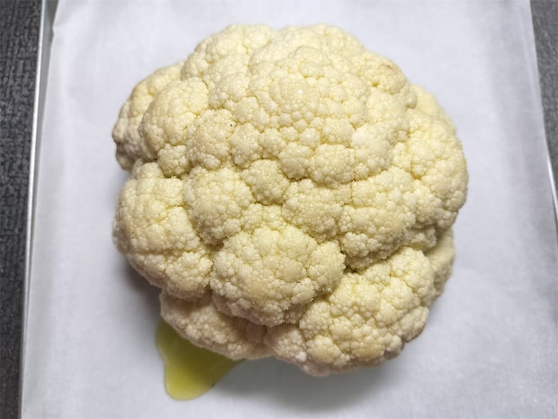 1. クッキングシートの上にカリフラワーを乗せて、オリーブオイル大さじ2をかけます。