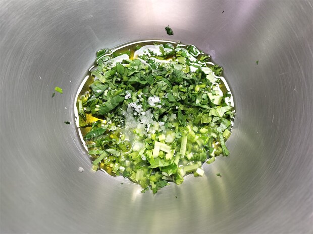 4. ボウルにパクチーを入れ、塩、オリーブオイル大さじ2、レモンを加えて混ぜます。