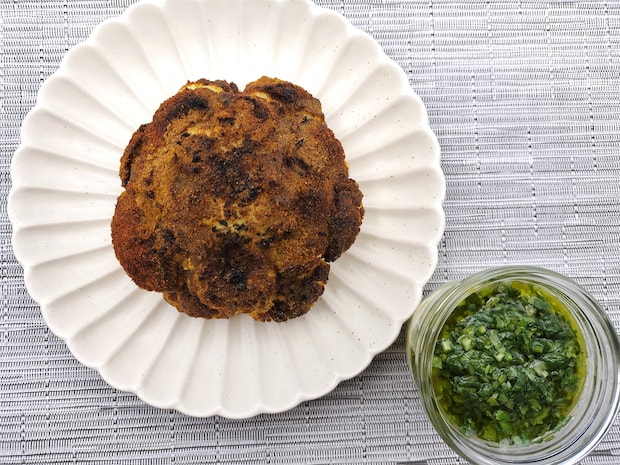 そのままでもスパイシーでおいしいのですが、ソースをつけるとパクチーとスパイスの尖ったところが中和されて、マイルドにも感じます。個人的にはソースをつけた方が好きです。オーブンに入る大きさのカリフラワーであることが条件ですが、もし大きすぎた場合は、下側の小房を少し削れば、高さを調整出来ます。またレシピではクミンやコリアンダーは大さじ1ですが、カリフラワーの大きさやスパイスの好みで加減してみてください。