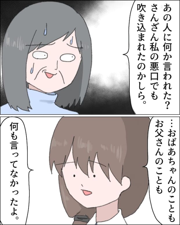 「あの人に何か言われた?さんざん私の悪口でも吹き込まれたのかしら」そう言いながら少し焦った様子のおばあちゃんを見ながら、「・・おばあちゃんのこともお父さんのことも、何も言ってなかったよ」と答えました。