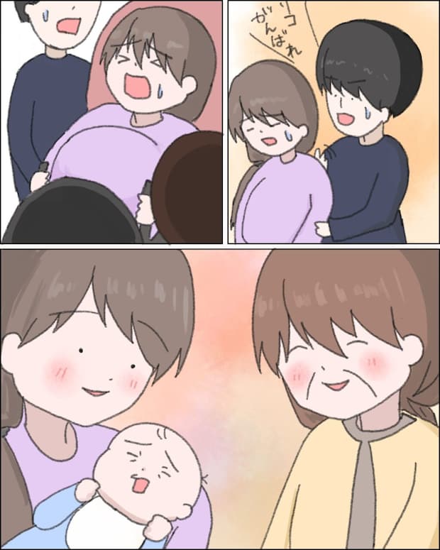 その後、いよいよ出産のときを迎えた私は、夫に支えてもらいながら無事出産。かわいい男の子を授かり思わず笑顔に。息子を抱いた私の隣にはお母さんが笑顔を浮かべて立っていました。
