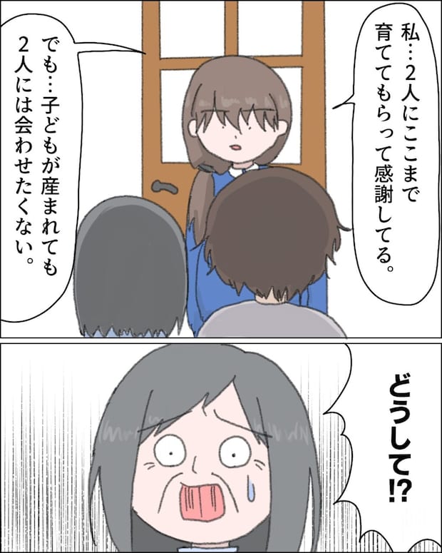 そして、「私・・2人にここまで育ててもらって感謝してる。でも‥子どもが産まれても2人には会わせたくない」私がそう言うと、「どうして!?」驚きながら義母が言いました。