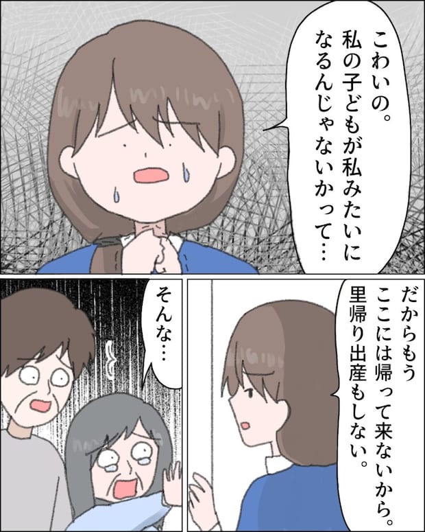 「こわいの。私の子どもが私みたいになるんじゃないかって・・」そう言った後、「だからもう、ここには帰って来ないから。里帰り出産もしない」わたしの発表に「そんな・・」と義母がショックを受けていました。