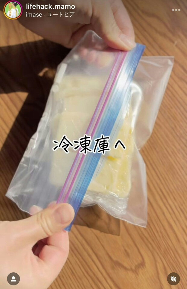 ラップでまとめたバターは保存袋に入れて冷凍庫で冷凍保存。凍ったバターは使う分だけ取り出しやすく、冷蔵保存していたものと変わりなく使用できるようです。今後、バターを購入した際にはぜひお試しくださいね。