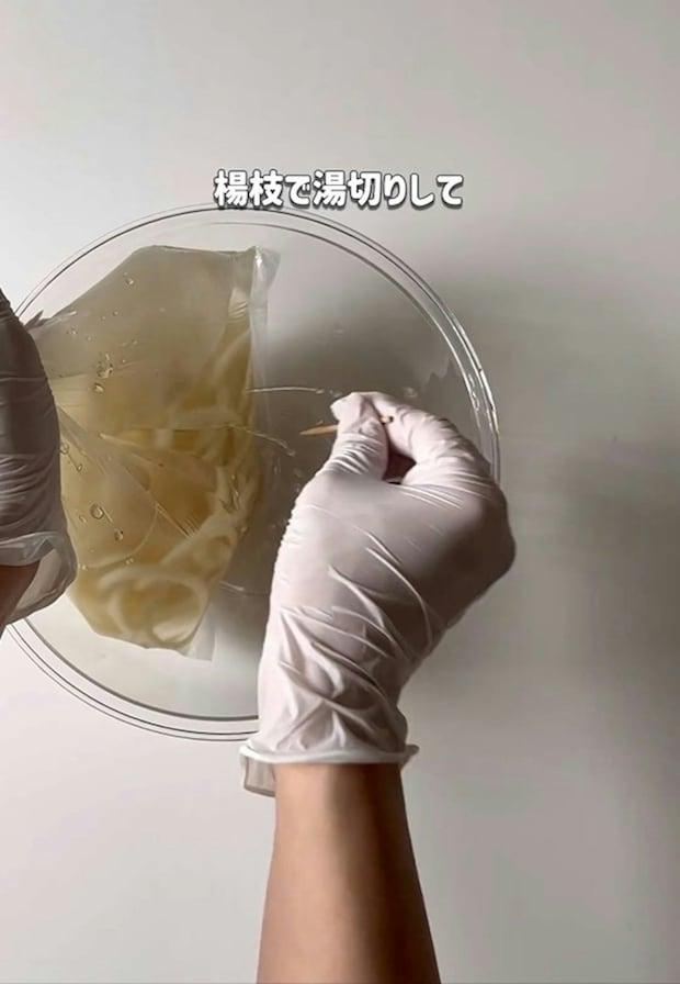 楊枝を使ってポリ袋に穴をあけ、ボウルでお湯を切る