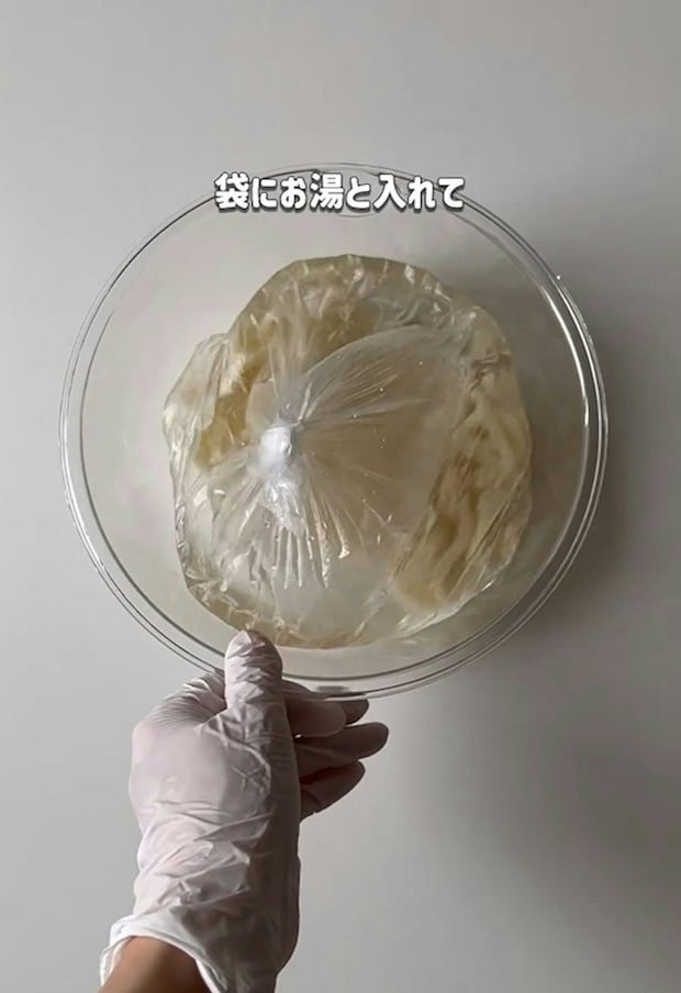 冷凍うどんを入れたポリ袋の中にお湯を加えます。その際、途中でお湯がこぼれると危険なので、必ずボウルで受けるようにしましょう。