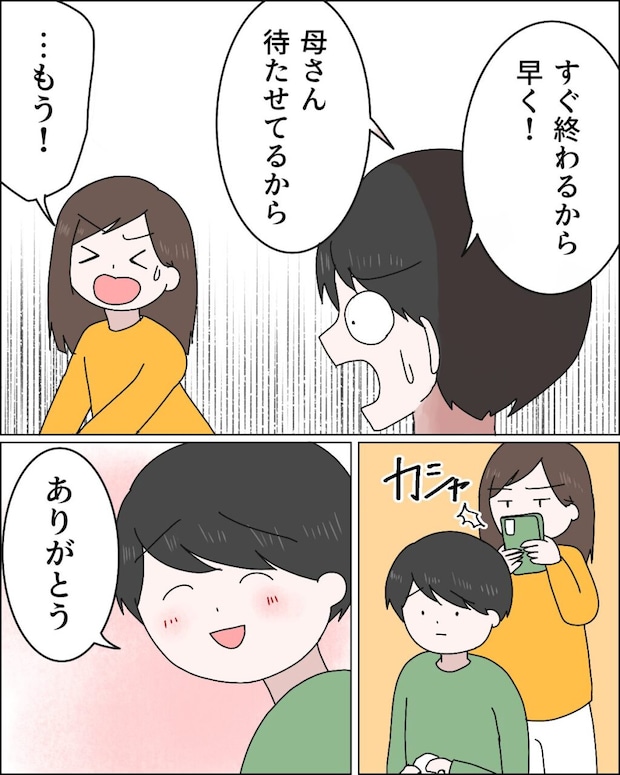 しかしマサオは、今すぐ写真を撮って義母に送りたいようで、「すぐ終わるから早く!母さん待たせてるから」と私を急かしてきます。「・・・もう!」と声を上げながら、私は結局言われるがまま首の後ろを撮影。写真を確認したマサオは満足したのか、「ありがとう」とふわっと笑いました。