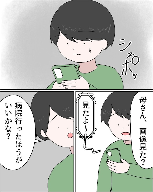 マサオは撮った写真をさっそく義母に送ると、再び電話をかけて「母さん画像見た?病院行ったほうがいいかな?」と不安そうに尋ねました。私が見た限りでは、どう考えても大したことはありませんでしたけどね・・・。