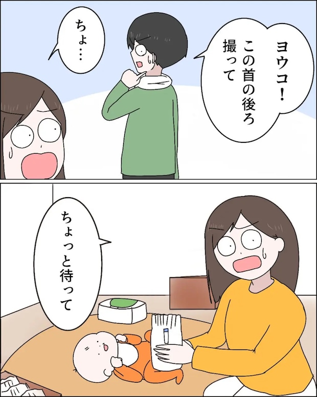 マサオは慌てて電話を切ると、「ヨウコ!この首の後ろ撮って」と言ってきました。私はおむつ替えの真っ最中。今このタイミングで!?この状況が見えてないの?突然の要求に頭が追いつかず、軽くパニックになりながら「ちょ、ちょっと待って!」と声をかけます。