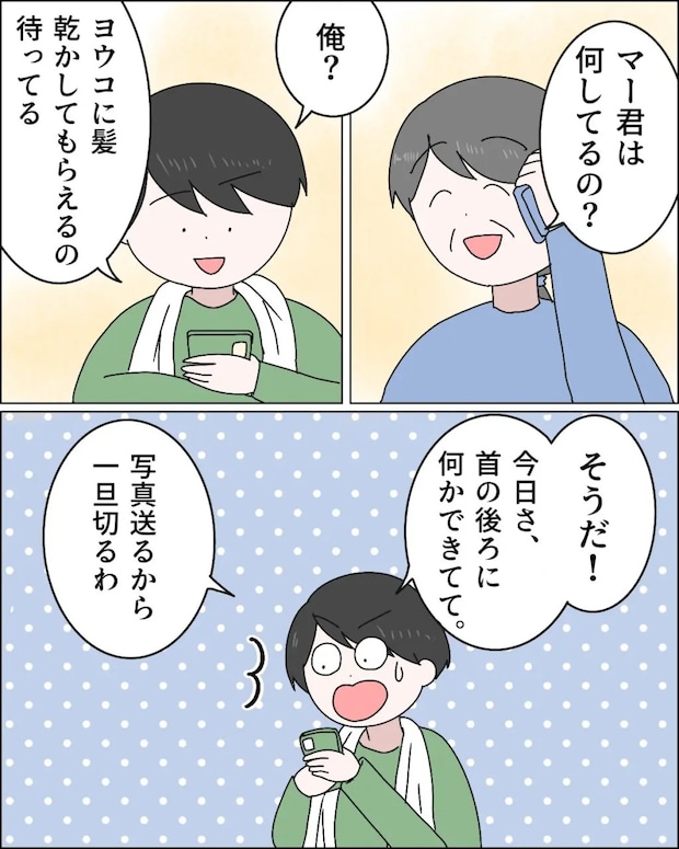 しかも、ほとんどが中身のない会話。「マー君は何してるの?」「俺?ヨウコに髪乾かしてもらえるの待ってる」まるで付き合いたてのカップルのようなやり取りに、聞いているこっちが恥ずかしくなります。暇そうで羨ましいなと思いながら聞き流していると、マサオが突然「そうだ!今日さ、首の後ろに何かできてて・・・写真送るから一旦切るわ」と言い出しました。