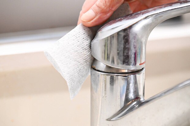 「水回りの汚れ用 掃除シート」は、洗剤を準備する必要がありません。シートを軽く濡らして、気になる汚れ部分をこするだけで簡単に使えます。研磨剤を使用していないため、ゴシゴシ擦っても素材を傷める心配がなく安心ですよ。