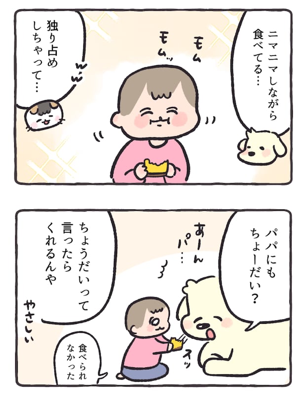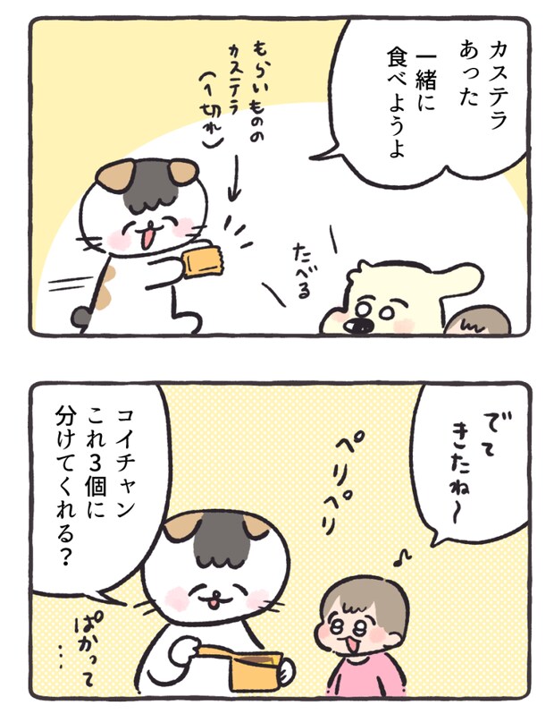 2025年12月30日 カステラを3人でわけっこ。しかし美味しすぎて……/ケチャップとマヨ のんびりおっとり成長記 ASOPPA! めったに食べられない美味しいカステラ…… 登場人物紹介 頂きもののカステラ1切れを発見 まとめ 珍しくいっぱい食べたい! なコイチャンでした。 そんなにでっかいおくちしてないよ!! 普段は独り占めしないので可愛かったです……。 漫画・文/ハズレ