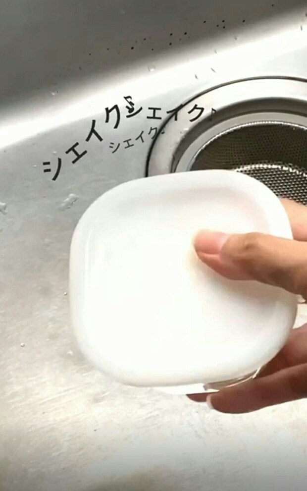 そのままシェイクするようにタッパーを振ります。万が一、水がこぼれても大丈夫なように、シンクの上で行うと良いですね。