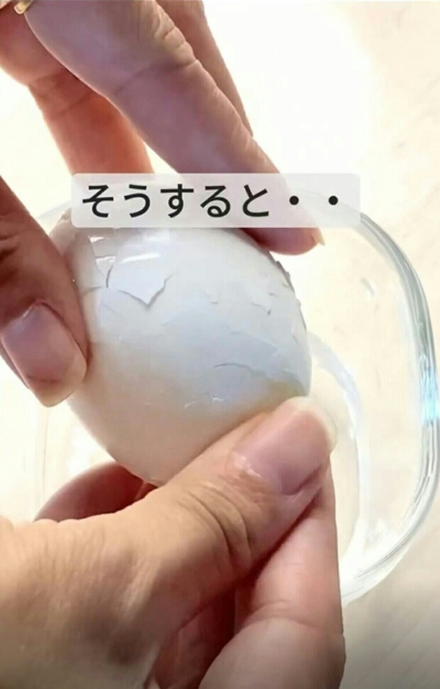 ふたを開けて、ゆで卵を取り出すと、ひびが入っていることが分かります。