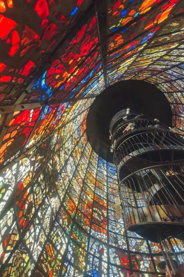 ステンドグラスの光に包まれながら螺旋階段を上っていく、塔の中に入れる体験型の作品。
