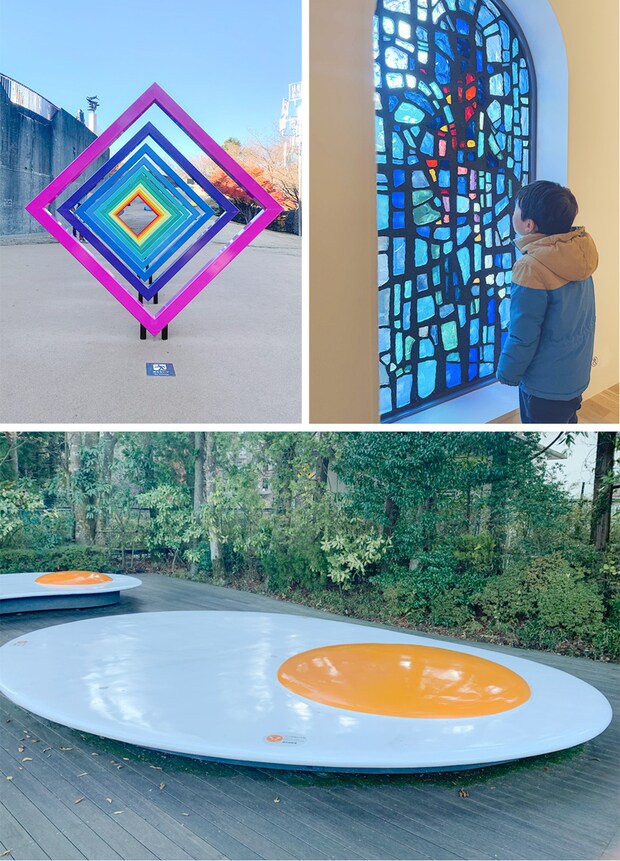 見るだけでなく、触る・座る・くぐるなど、体を使って楽しめる作品が沢山あります。