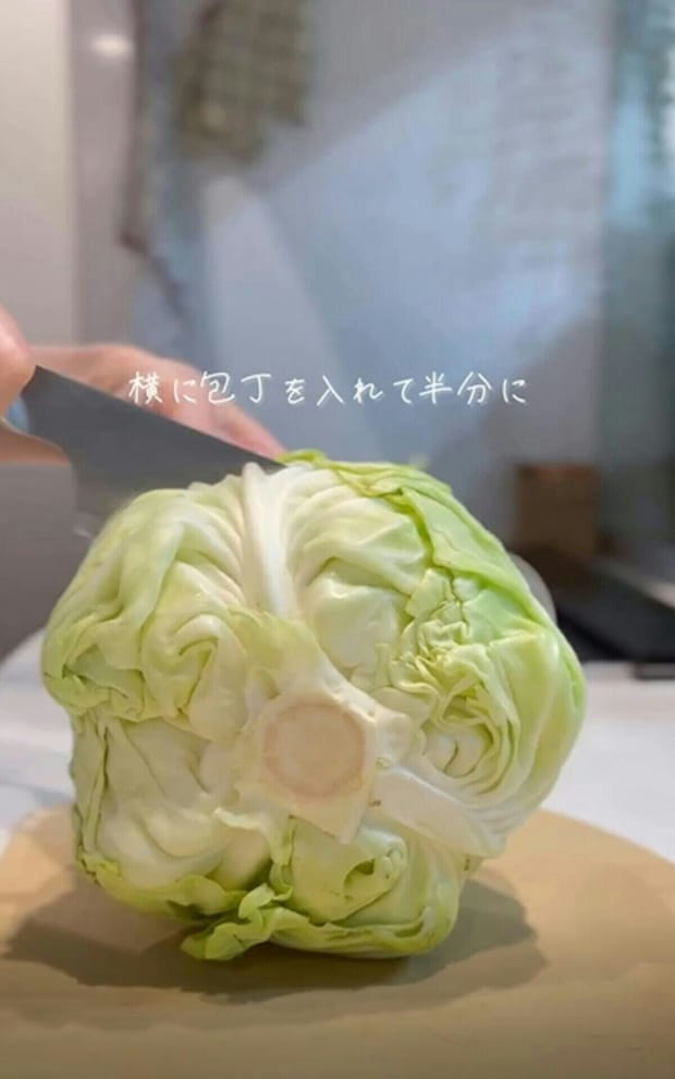 この状態でキャベツを半分に切ります。