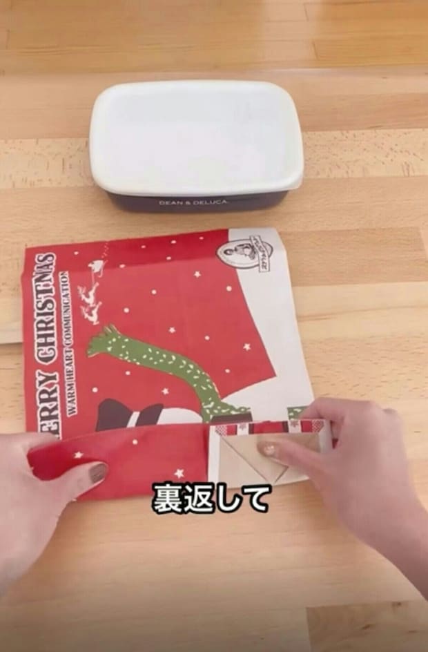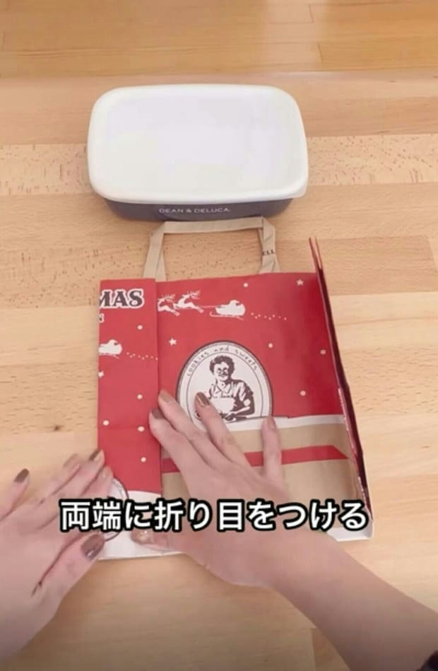 両端に折り目を付けたら、紙袋を裏返します。