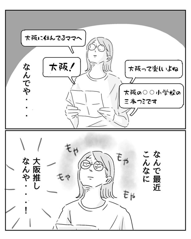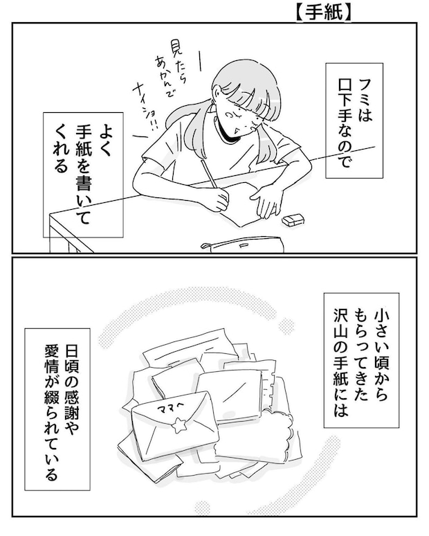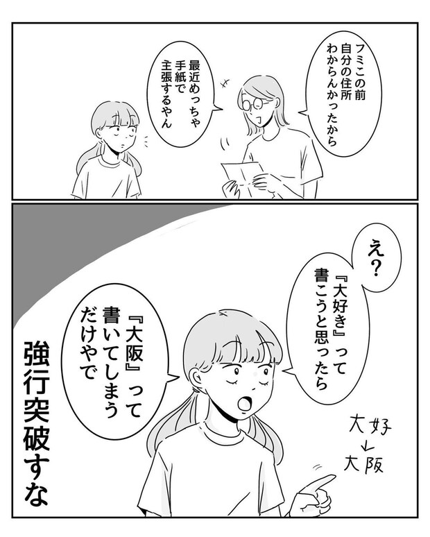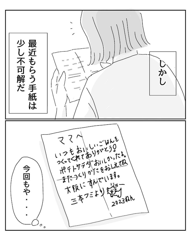 ママの推理はまさかのハズレ。「大好き」と書いたつもりが、まさかの「大阪」になってしまっていたとは思いもしませんよね。書き直せばいいところを、そのまま強行突破で手紙を書き終えていたという展開に、思わずクスッとしてしまいます。予想外の答えに肩の力が抜けて、なんとも言えない可愛らしさが残るエピソードですね。