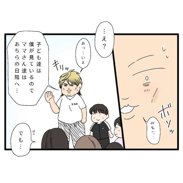 子どもたちを信也さんだけに見てもらうのは申し訳ないと思ったママさんたちは、大変になってしまうからと遠慮しましたが。信也さんは「紫外線は女性の天敵と妻からよく聞かされていますから。」サラリとかっこいいセリフ。何かあったら声をかけるから大丈夫、とキリリとしたキメ顔を見せるのでした。こんなパパ見たことないとでも言いたげに、コウキくんが不思議そうに信也さんを見上げていましたが、そんなことはお構いなしの信也さんです。