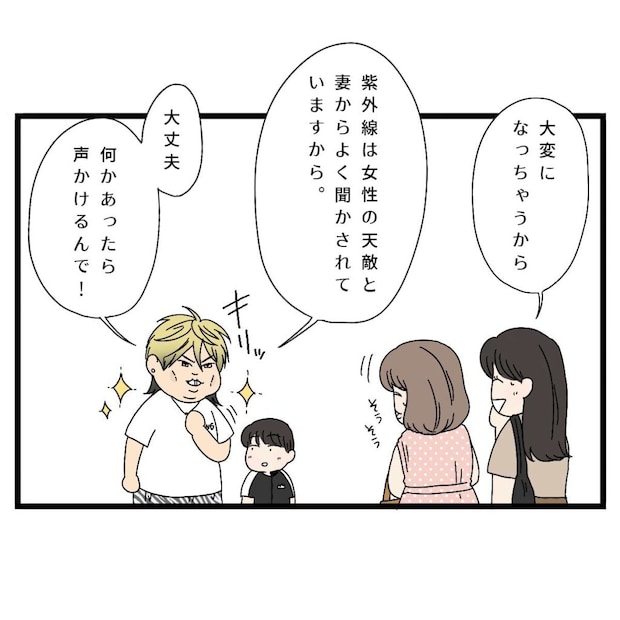 ゲームに夢中になりながら頭が痛いなどと見え透いた嘘をつく信也さん。サチさんの無言の圧にはかなわないようですね。かわいいママさんたちにいいところを見せたくて必死な姿に笑ってしまいました。紫外線に当たらないように、日ごろからサチさんにも気を遣ってくれていることを願います。