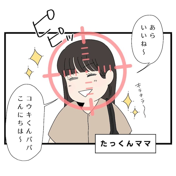 たっくんママは、ロングヘアが似合う美人さんです。「あらいいね~」とコウキくんにもフレンドリーに話しかけて、「コウキくんパパ、こんにちは~。」とキラキラ眩しい笑顔で挨拶しました。