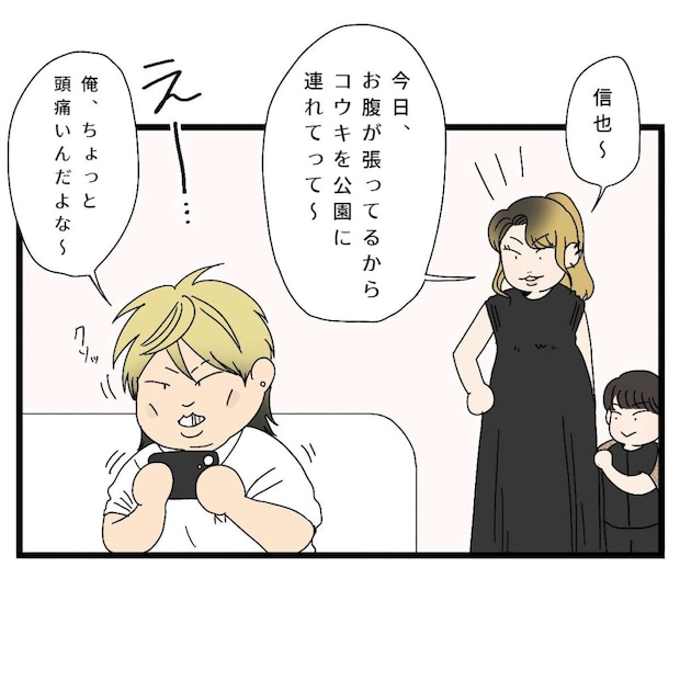 妊娠中の妻のフォローも育児もやる気がない信也さんの「頭痛い」という見え透いた嘘などまったく相手にしないサチさんは、ただ信也さんの背後に立っていました。その圧とにらみが効いたのか、信也さんは渋々コウキくんを公園へ連れていくことにしました。サチさんを怒らせたらあとが怖いことが信也さんにはよくわかっているのかもしれませんね。