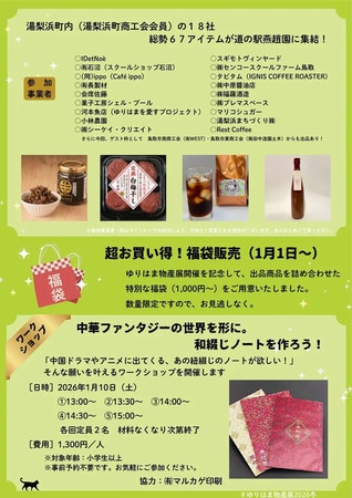 鳥取県湯梨浜町の「道の駅燕趙園」にて、12月25日(木)~2026年1月25日(日)の期間限定で、地元企業の食べ物や雑貨などをギュっと集めた「ゆりはま物産展」を開催。1月10日(土)限定で和綴じノート作り体験も実施される。