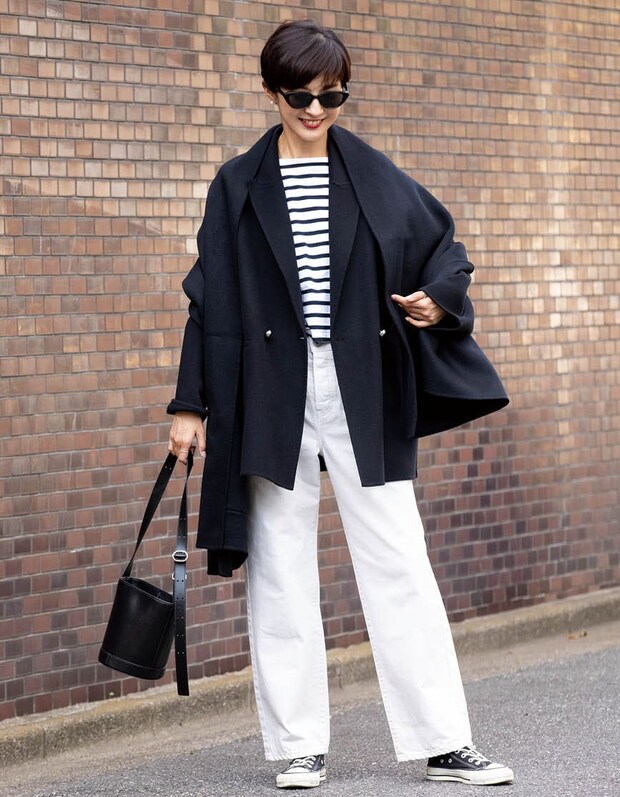 「ウールのショートコートを使ったマリンムードなトラッドルック。同素材のストールを巻いてコーデに奥行き感をプラスしています。サングラスでモダンに」