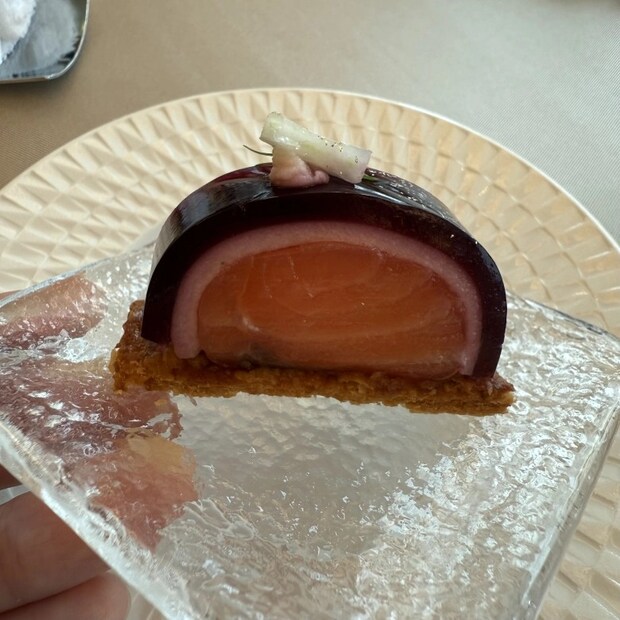 さらに、ナイトティー限定メニューにはなりますが、特に気に入ったのが「サーモンと赤ワインのショーフロワ フェンネルのムース」。低温調理したサーモンの上に赤ワインの香りがふわっと広がるゼリーが乗っていて、乾杯のスパークリングワインと相性抜群!夜のご褒美にぴったりの一品でした♡