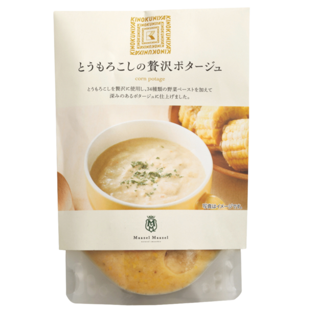 たっぷりのとうもろこしに、34種類の野菜ペーストを合わせた贅沢なポタージュ。トロッと濃厚なスープは1杯で十分な満足感。¥538(紀ノ国屋)