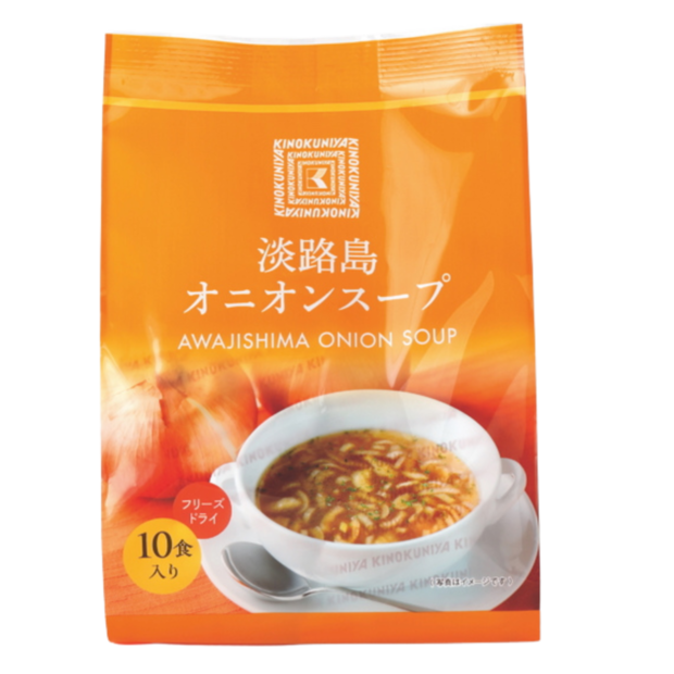 淡路島の玉ねぎを使ったコンソメベースのオニオンスープ。バターをきかせたコクのある味わいは1杯で満足感のある飲みごたえ。10食入り¥1,479(紀ノ国屋)