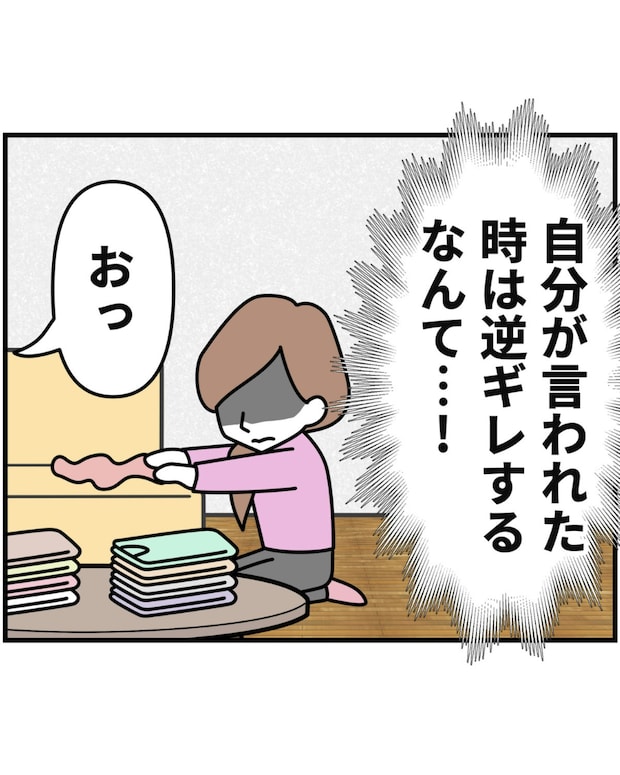 以前に夫から義母と比べられたこともあり、洗濯物はすぐに畳むようにしていたみゆきさん。それなのに夫は自分では洗濯物を畳むことはせず、妻へ逆ギレするというひどい仕打ちをしていたのです。