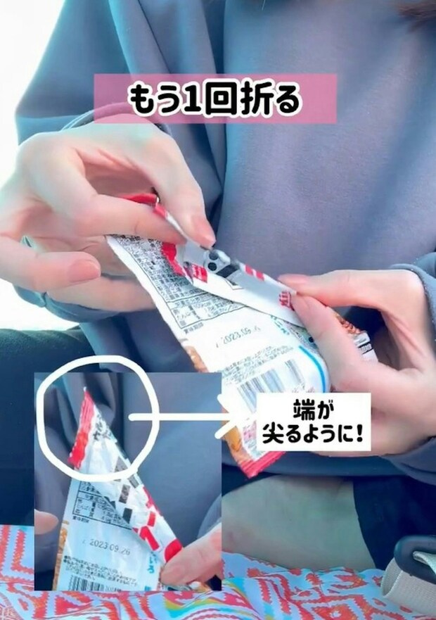 お菓子の袋の片側を細長い三角に折り、さらにもう一回折り込む