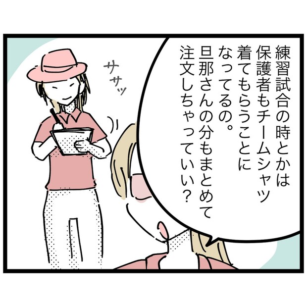新リーダーの先輩ママから集合がかかり、チームTシャツの注文について説明を受けたもっつんさん。