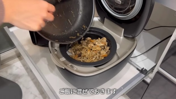 から揚げなどのおかずとしてもよく登場する鶏もも肉ですが、混ぜご飯の具材にもぴったり♪先ほど紹介したえのきやごぼう、油揚げといったお好みの具材を調味料で煮詰めて、炊き立てのご飯に混ぜるだけです。炊き込みご飯よりも味がしっかりとしているので、ayaさんもお気に入りのメニューだそう♡