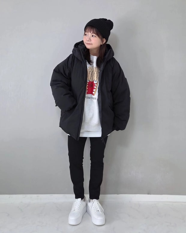 こちらは、ブラックのウォームパデッドパーカに黒スキニーを合わせた、クールなモノトーンスタイル。@panko0821さんは、キャッチーなスウェットとニット帽で、遊び心を添えたコーデに仕上げています。
