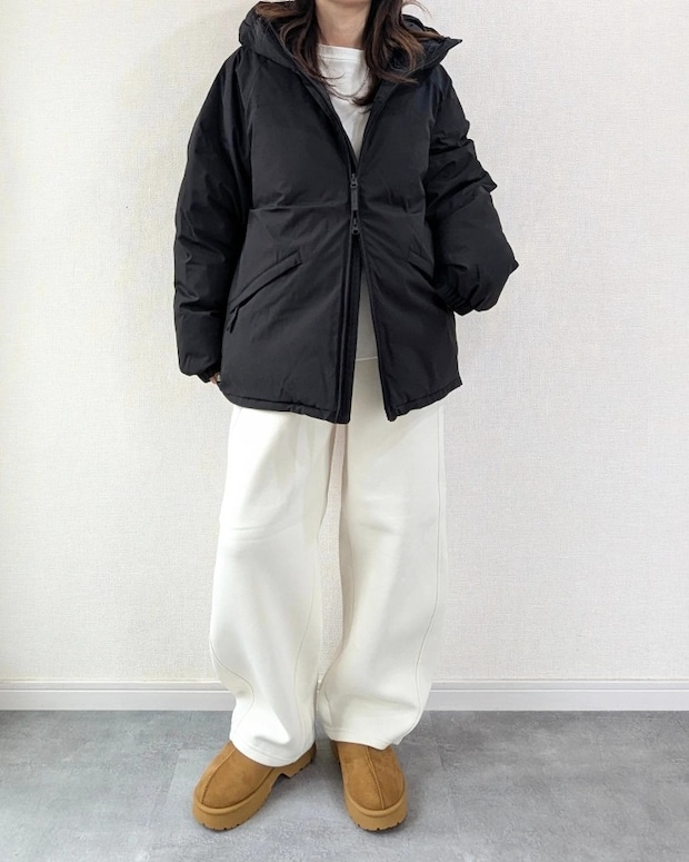 こちらは、ウォームパデッドパーカにカーブパンツとブーツを合わせた、@marino12131さんの大人なスタイルです。インナーとボトムスを白で統一して縦長ラインを作り出し、ブラックのウォームパデッドパーカを重ねてコーデを引き締めています。足元のキャメルが上品なアクセントになっていますね。