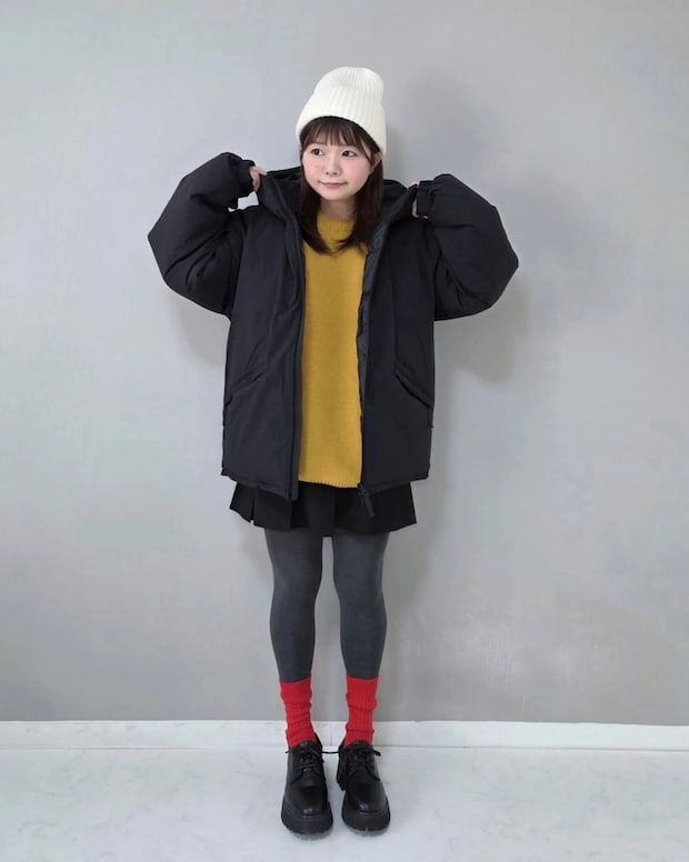 暗くなりがちな冬のコーデですが、カラフルなアイテムを組み合わせるのもおすすめです。@panko0821さんは、ウォームパデッドパーカやプリーツミニスカート、シューズを黒やグレーで統一。そこにマスタードイエローのニット、赤ソックスをプラスして元気なかわいさを演出しています。チャコールグレーのタイツを挟むことで、カラフルな配色もまとまりのある印象になっていますね。