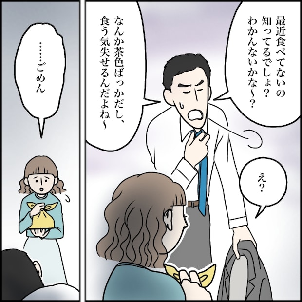 すると、「最近食べてないの知ってるでしょ?わかんないかな~?」タカシに呆れたように言われても意味がわからず「え?」とまた聞き返すと、「なんか茶色ばっかだし、食う気失せるんだよね~」タカシの言葉に「・・ごめん」としか言えませんでした。