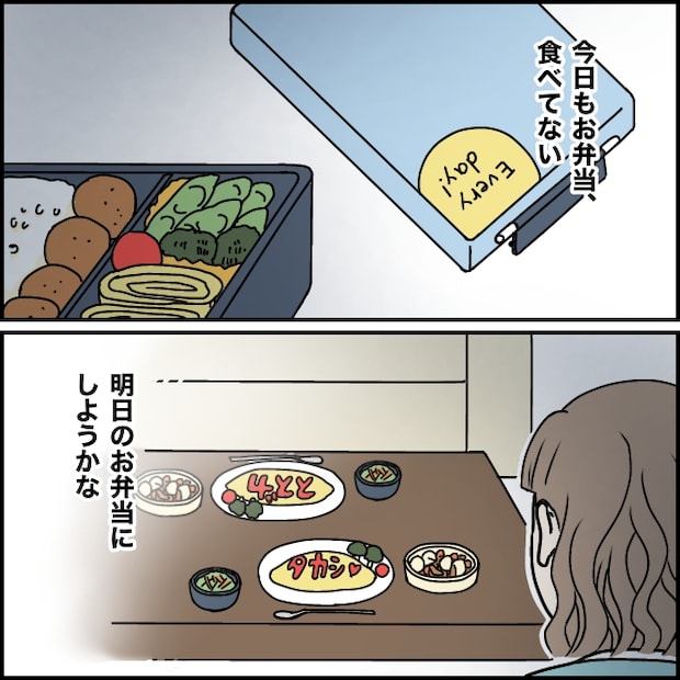 タカシが持って行ったお弁当箱を取り出してみると朝詰めたまま。それを見て、「今日もお弁当、食べてない・・明日のお弁当にしようかな」と呟きました。