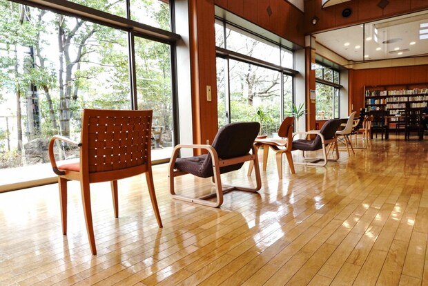 特に庭園に面した窓ガラスに向かって椅子が並ぶ光景は圧巻で、窓ガラスがあけられている日には、樹木の香りや自然の風を感じながら読書することもできます。