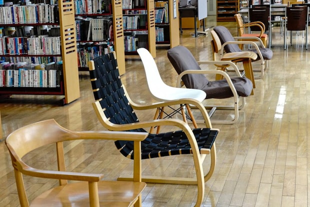 有名なデザイナーズチェアが並ぶ「安来市立図書館」。