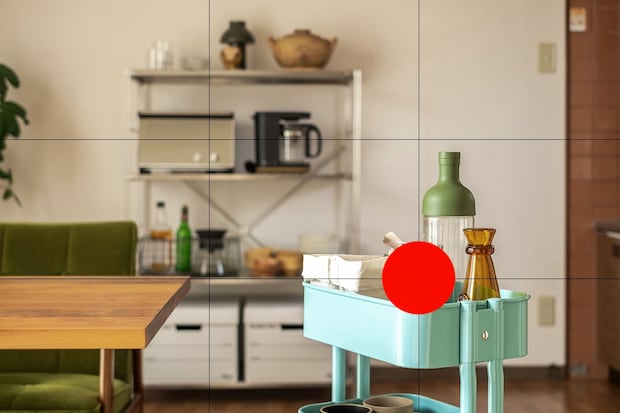 飾る空間を1枚のシーン写真と見立て、その写真を三分割にするイメージ。その3分の1または3分の2の位置に対象物を設置する方法です。
