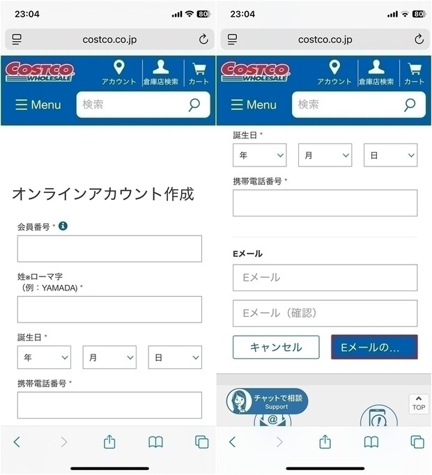 登録手順ですが、まずコストコのメルマガ登録ページへ遷移し、「ログイン / オンラインアカウント作成」をタップします。