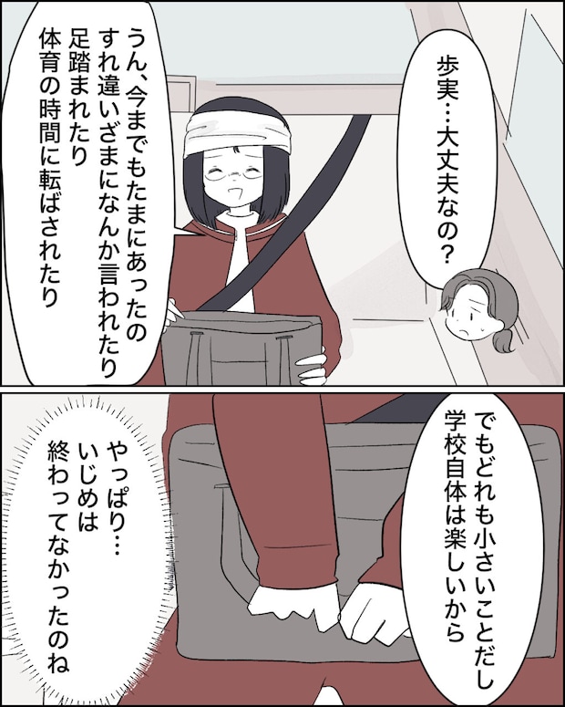 中学2年生の歩実ちゃんのママ美沙さんは、教科書の落書きやボロボロの靴や体操服を見て歩実ちゃんが学校でいじめられていることに気づき、夫の博之さんと相談し見守ることに。ある日いつもより帰宅が遅かった歩実ちゃんのカバンに悪口が書かれビリビリに破れたノートを見つけ、黙っていられず歩実ちゃんを問い詰めると、泣きながらクラスメイトの風見さんとその友達にいじめられていると打ち明けてくれ、学校に連絡し、話し合いの場をすることに。でも優等生として有名な風見さんは、テストで負けて悔しかったと話した友達が勝手に歩実ちゃんに嫌がらせをしたと涙ながらに話し、先生たちはすっかり信じてしまいます。しかし、風見さんの嘘泣きに気づき、話し合いの後すれ違いざまに「告げ口してんじゃねーよ」と歩実ちゃんにボソッと言ったのを聞いて美沙さんはいじめを確信。帰宅後、転校を促すも、友達もいる今の学校がいいと聞いて意思を尊重することに。3年生になり風見さんとクラスも離れ、以前より楽しそうな様子の歩実ちゃんを見てホッとする美沙さんと博之さんは、愛猫クッキーに似たかわいい猫のキーホルダーをカバンに付けてとプレゼントし、「今度こそ絶対に歩実を守ろうな」と話し合いました。そんなある日、学校から歩実ちゃんがケガをしたと連絡があり慌てて駆け付けた美沙さんと博之さん。付き添ってくれた先生が謝りながら経緯を話してくれ、男子生徒が蹴ったボールが頭に当たったと知るも、軽度だったことから元気そうな歩実ちゃんを見てホッとして先生にお礼を伝えました。