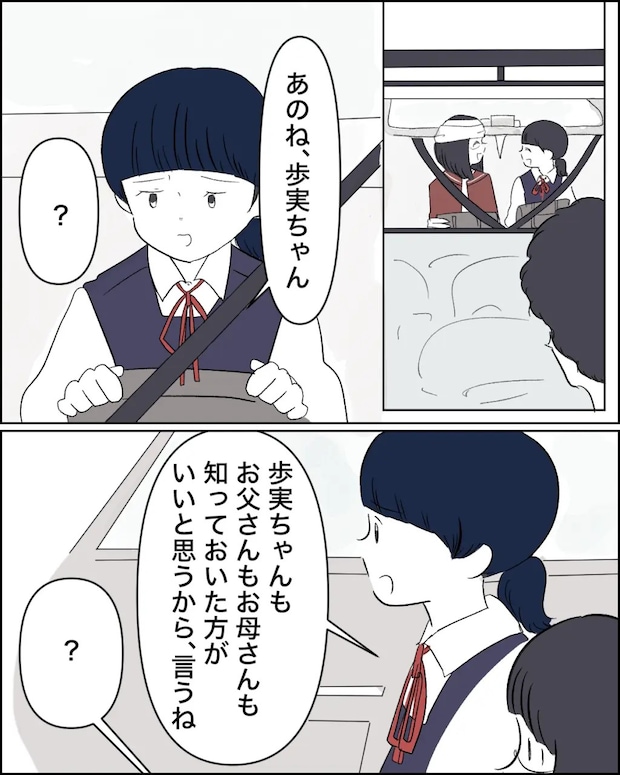 仲良く後部座席に座り、笑顔で話している2人。すると、「あのね、歩実ちゃん」と突然静かになったカナちゃんがそう言い、何事かと思っていると、「歩実ちゃんも、お父さんもお母さんも知っておいた方がいいと思うから、言うね」そう切り出すカナちゃんに私たちも驚きました。